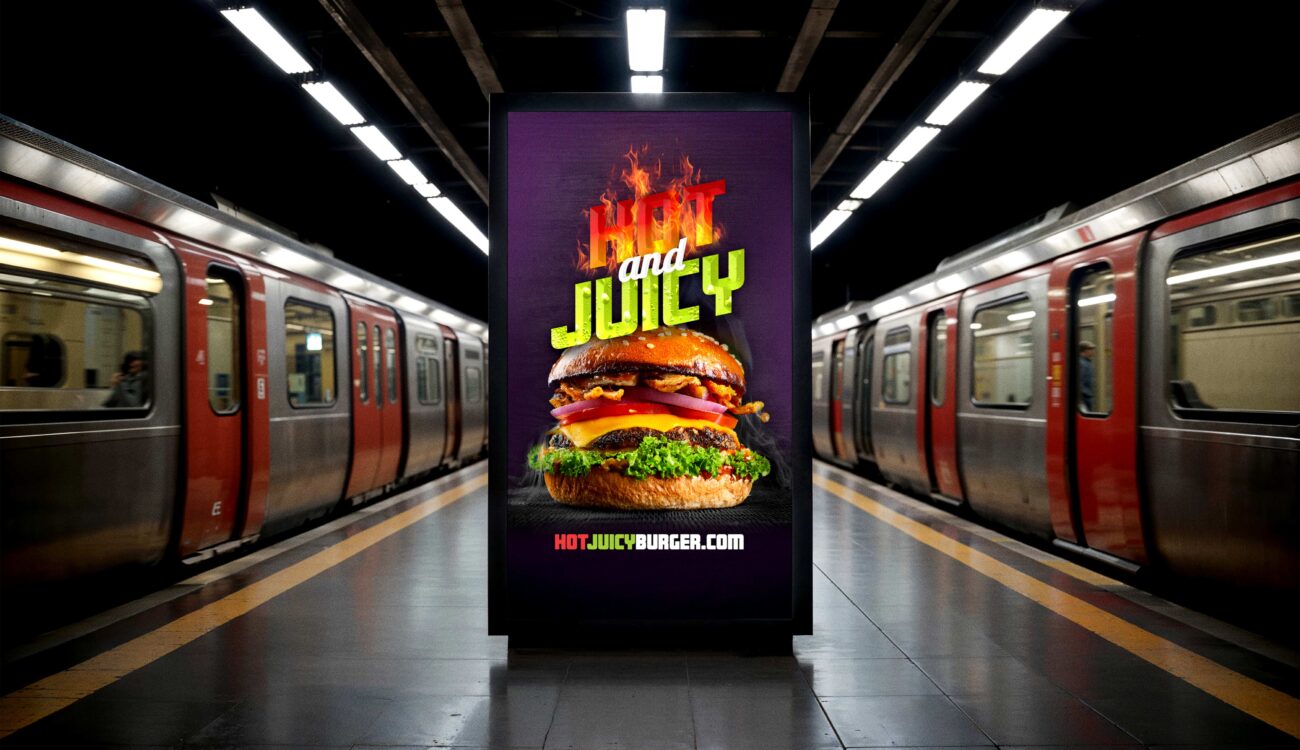 Ich habe „Hitze“ und „Saftigkeit“ als Gegenspieler inszeniert: ein Orange-/Rot-Spektrum für HOT, Limetten-/Grüntöne für JUICY, getragen von einem dunklen Hintergrund. Klare, kräftige Headline kombiniert mit einer freundlichen Schrift für Kategorien/Preise. Ein eigenes Icon-Set (Burger, Pommes, Drink) sichert Wiedererkennbarkeit über alle Medien.